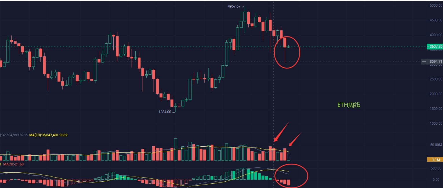 ETH:周线来看,反转的概率特别小。现在既然已经反弹上来,上方空间也有限,能冲到 3800 附近就已经很不错了。所以更划算的做法是,遇到小级别冲高时,慢慢布局空单,这样盈亏比更合适。