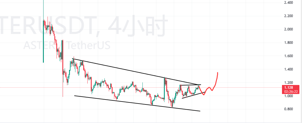ASTER :K 线形态还行,整体是下降楔形的走势。短期震荡了一阵子,已经走出底部样子,但小级别现在是上升楔形。等它回调到 1U 左右再考虑买多就行,这币潜力不小,多留意下。