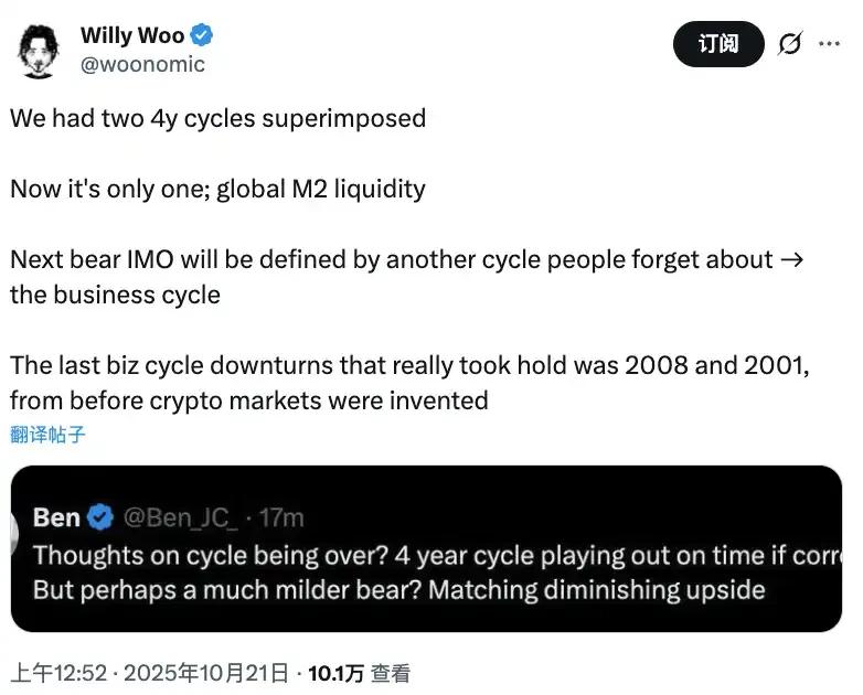 知名分析师 Willy Woo 提出了一个深刻的观点:过去推动比特币上涨的两大周期力量,正在逐渐消失,而未来真正决定行情的,将不是减半, 也不是流动性,而是宏观经济本身。