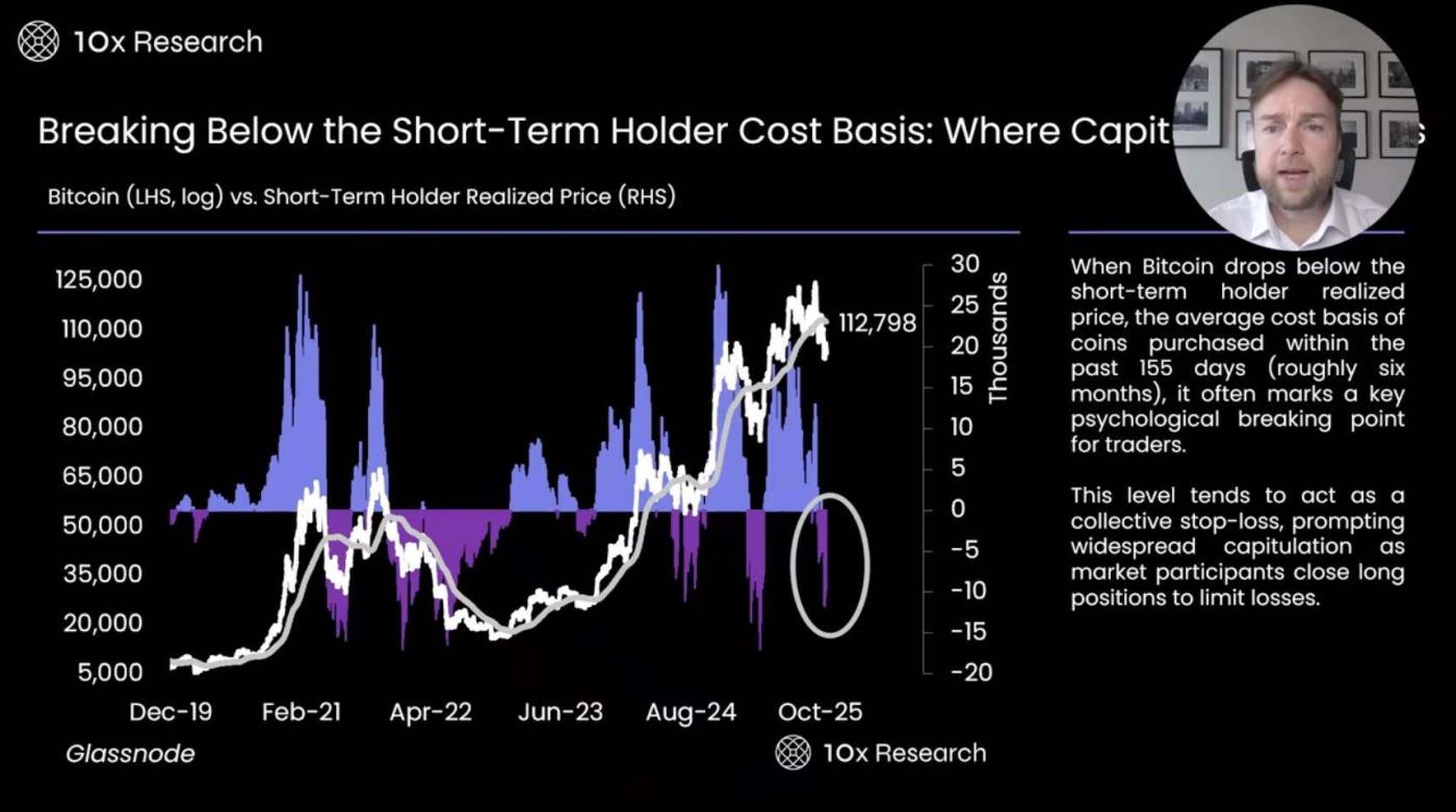 - 短期持有者的实现价格是一个关键指标,当前该价格为 112,798 美元(播客录制时),反映过去 155 天内短期持有者的平均买入水平。当比特币价格跌破这一水平时,投资者通常会选择止损,导致市场进一步下跌。这主要是因为短期交易者倾向于在价格上涨的预期下买入,而当价格跌破他们的买入价时,他们会迅速卖出资产。我们可以看到,当比特币跌破 113,000 美元时,价格出现了进一步下跌,同时引发了 10 月份的大规模强制平仓事件。