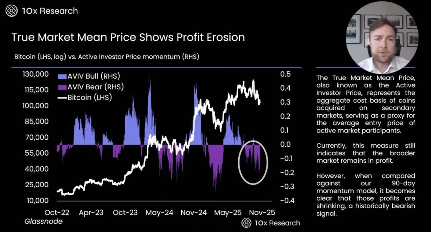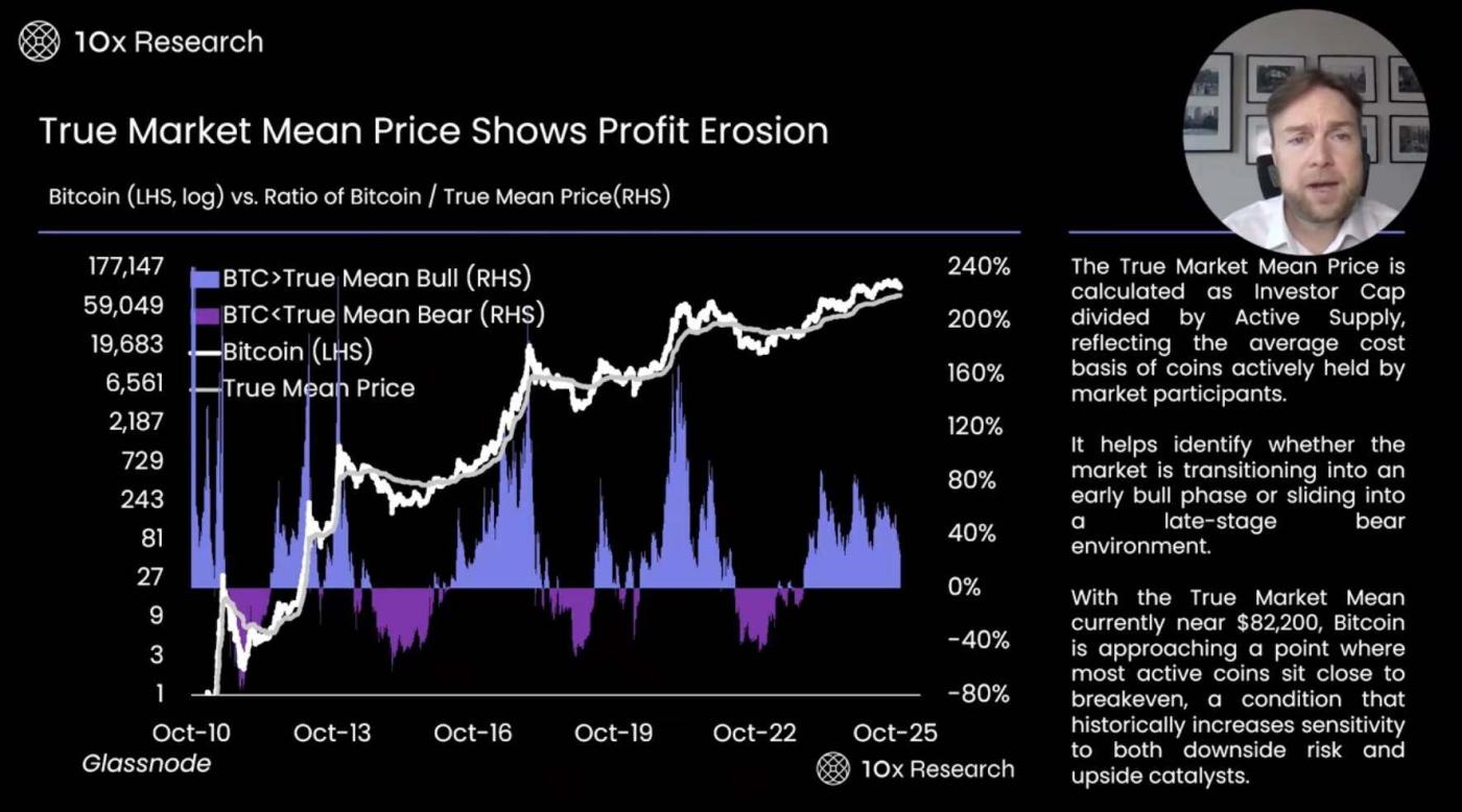- 链上指标为我们提供了更为谨慎的市场视角。例如,比特币与真实均价 (True Mean Price) 的比率是通过投资者市值 (Investor Cap) 除以活跃供应量计算得出的,用以衡量市场参与者持有币的平均成本。当前数据显示,短期持有者的市场动能正在逐渐减弱,大多数短期投资者正面临亏损。