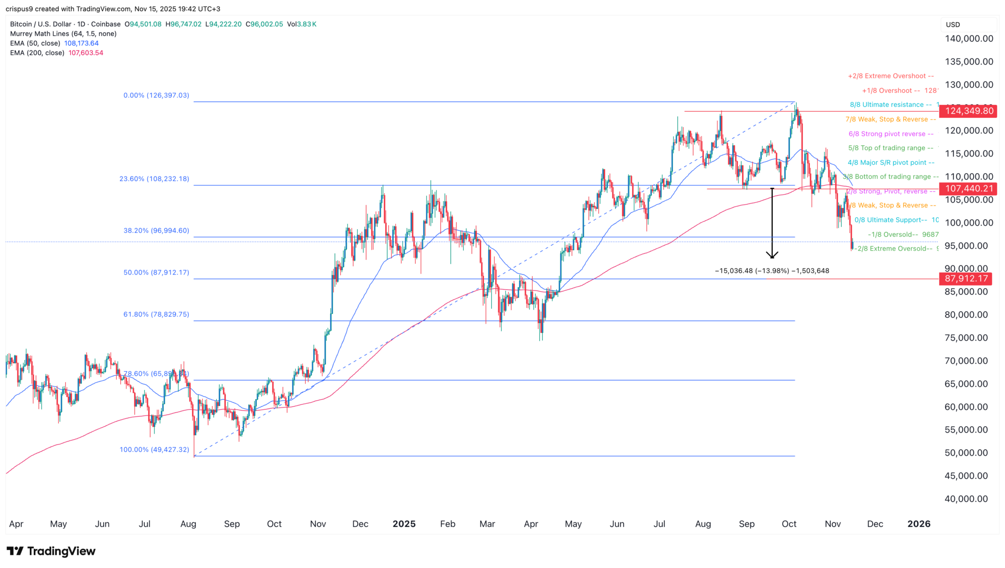 过去几个月,比特币价格持续承压,从10月的126,300美元高点跌至目前的95,785美元。此次暴跌与其他加密货币的走势如出一辙。那么,这种顶级蓝筹股的价格究竟能跌到多低呢?