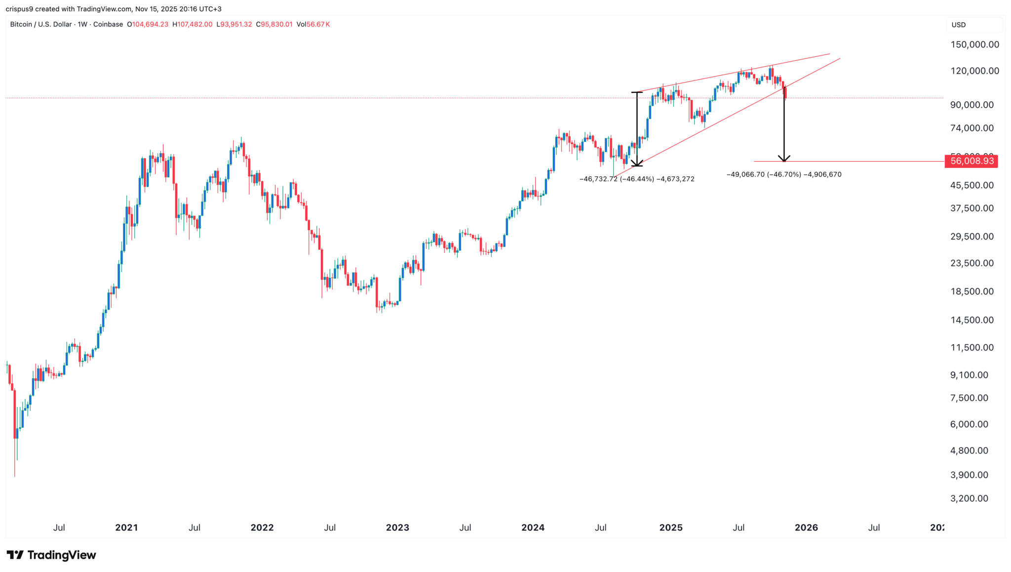 周线图显示,比特币价格目前处于疲软状态,因为它正在形成风险较高的上升楔形形态。这是一种独特的形态,由两条上升且收敛的趋势线所构成。通常情况下,当这两条趋势线即将收敛时,就会出现下跌突破。