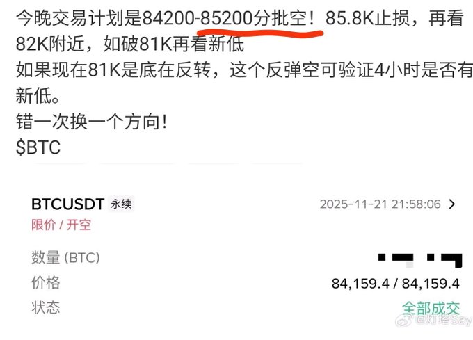 今晚交流计划已在84000上方先头仓空!85.5K止损,再看82K-80K附近