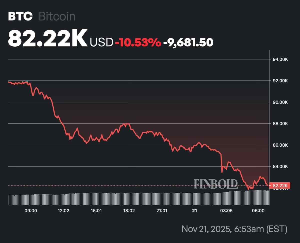 比特币本身遭受了最沉重的打击之一,周五凌晨一度暴跌至近 8 万美元,创下 5 月以来的新低。截至发稿时,价格已回升至 82,220 美元,但 24 小时图上仍下跌超过 10%。