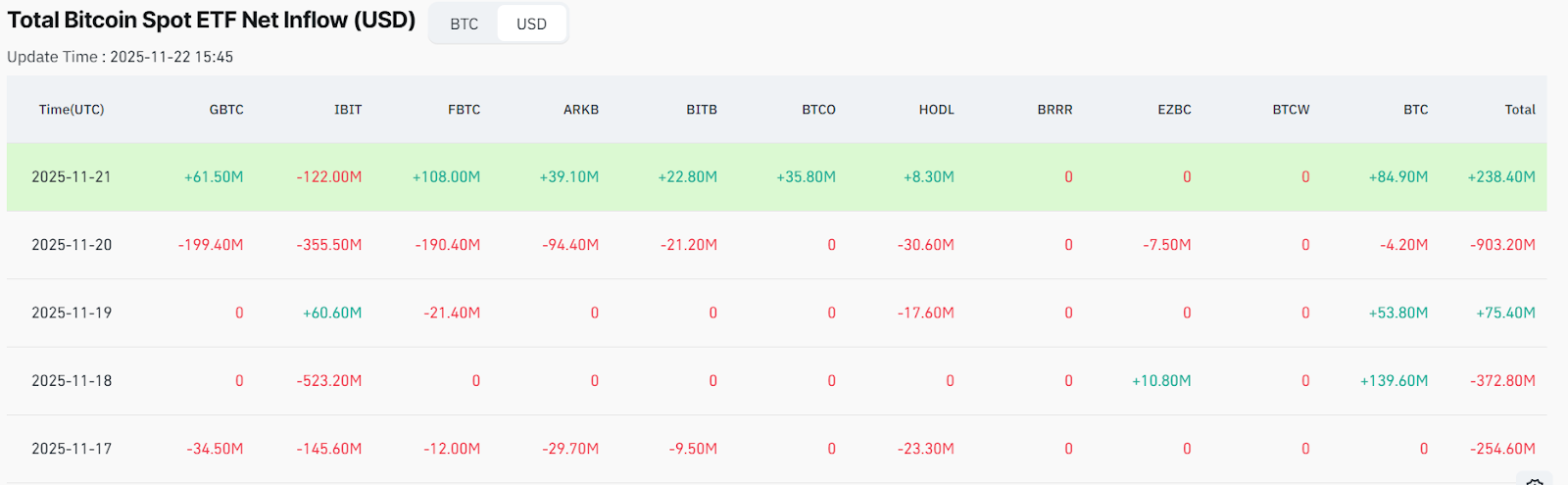 然而,11 月 19 日抛售潮短暂停止,IBIT 当天吸引了 6060 万美元的资金流入,这是该周唯一一个正收益日。