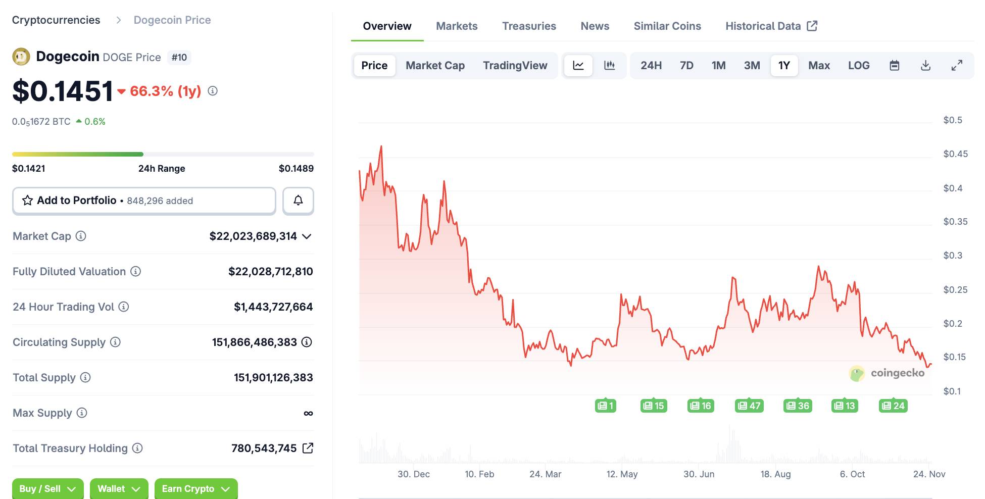 - 然而,截至发稿时,狗狗币价格徘徊在 0.145镁左右,过去一年下降了超过 66.5%。