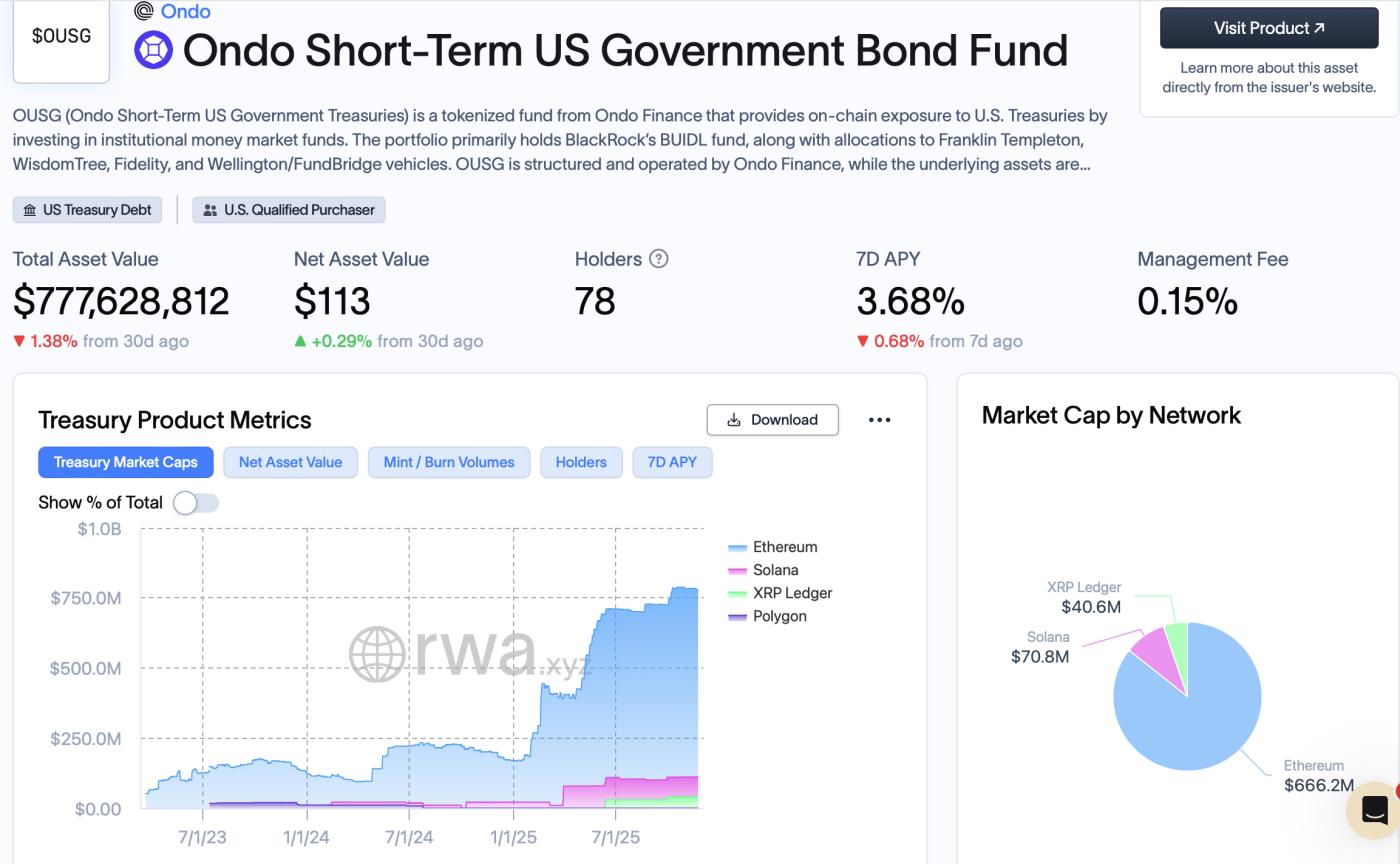 Ondo短期美国政府债券基金(OUSG)专为机构投资者设计,提供全天候24小时在线赎回的美国国债投资机会,预计年化收益率为3.68%。截至撰写本文时,该代币化基金的总锁定价值(TVL)约为7.77亿美元。