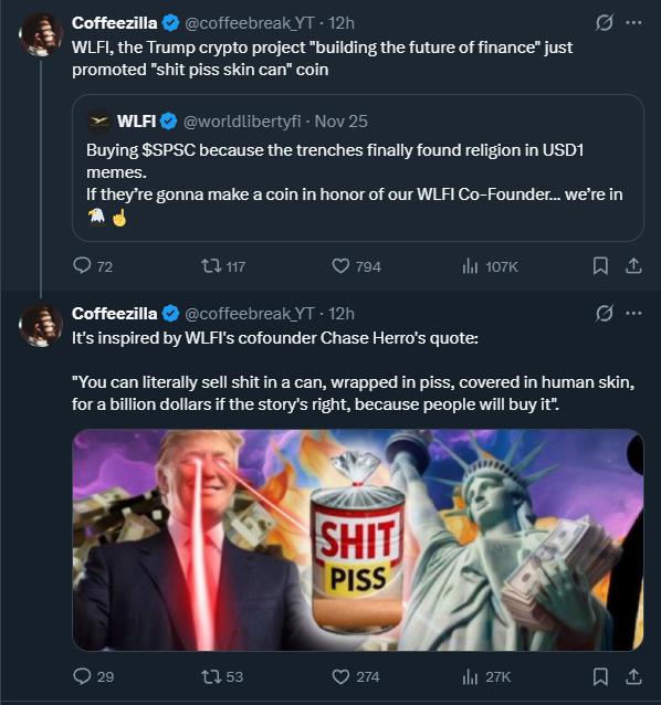 “特朗普的加密项目 WLFI 声称‘构建金融的未来’,结果却推广了一种名为‘sh t p ss skin can’的代币,”他写道。