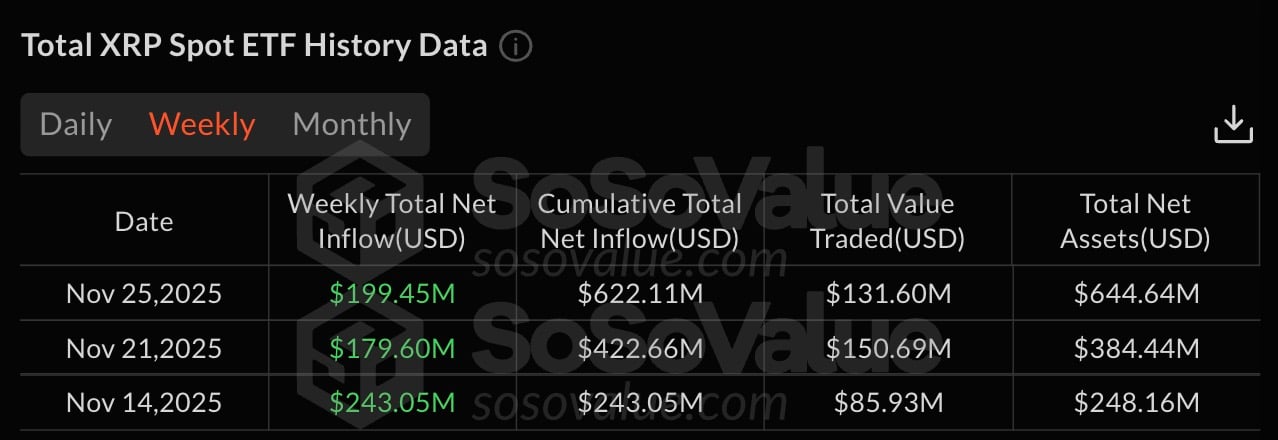 XRP现货ETF在新的一周开局强劲,远超上周整体表现,SoSoValue的最新数据显示这一点。新的一周仅有两个交易日(11月24日和25日),但总成交量已达1.9945亿美元。光是这两天的成交量就超过了上周整周的1.796亿美元。
