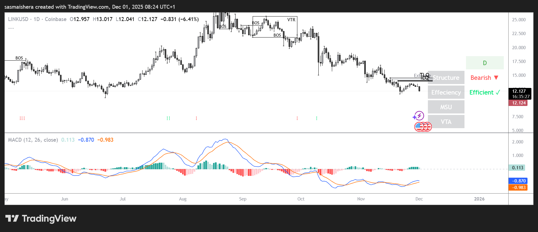 如果抛售持续,LINK 可能在未来几个小时内再次测试 11 月份的低点 11.386 美元。如果未能守住这一支撑位,LINK 可能自 6 月以来首次跌破 11 美元。