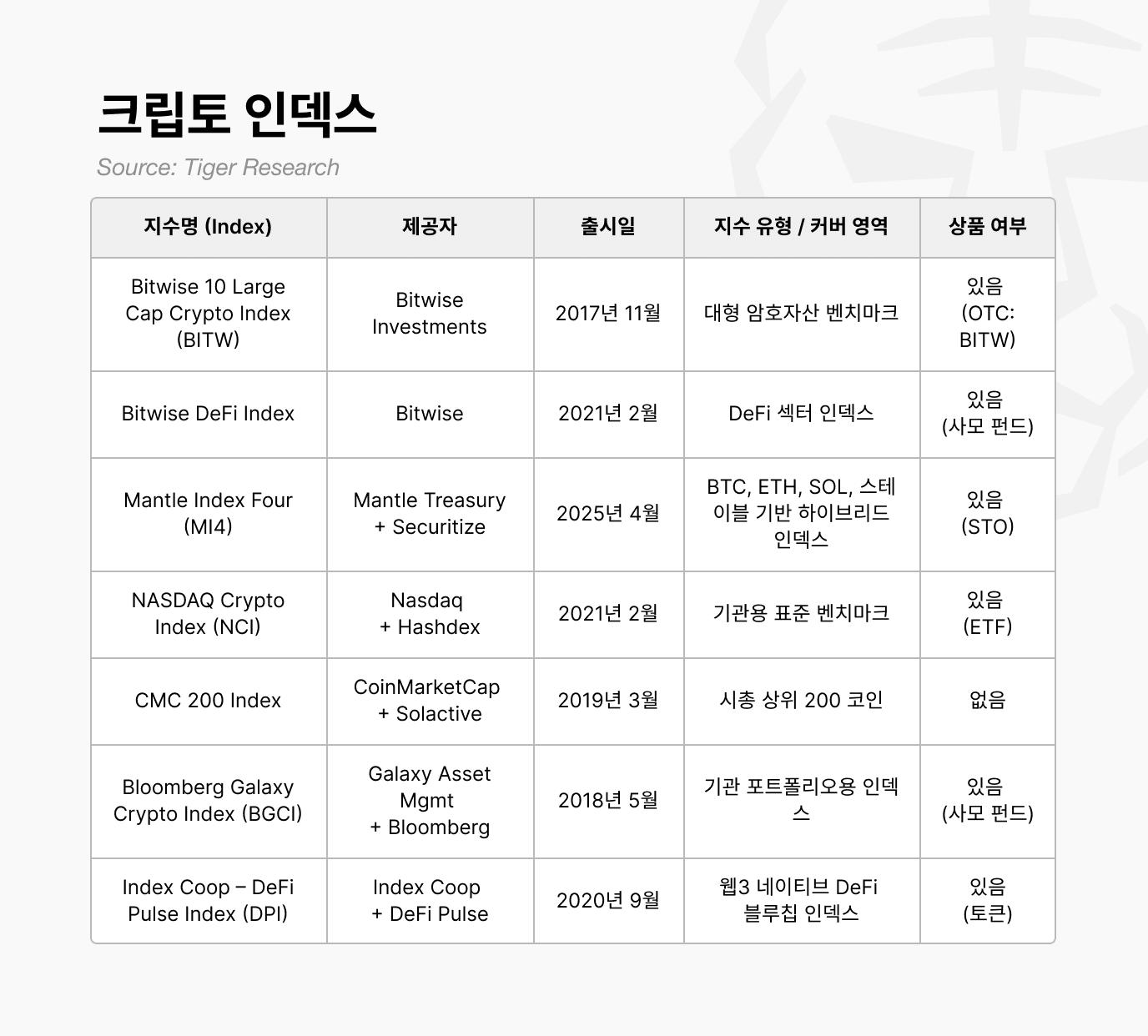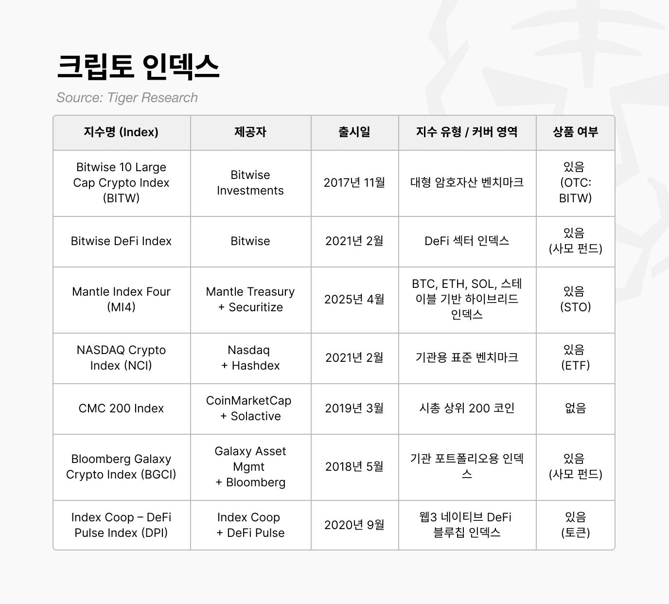 有一些机构会创建加密货币市场指数,例如 Bitwise、Coinmarketcap 和 Mantle。