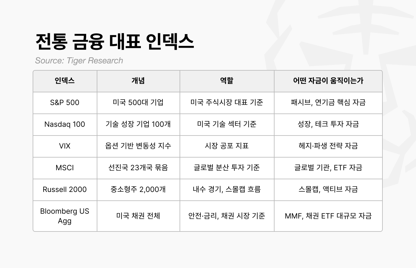 在传统金融领域,标普500指数、MSCI指数和那斯达克100指数等指数不仅仅是参考数字。它们是众多金融产品(包括ETF)的基础,也是决定数兆美元被动型基金流向的关键基准。