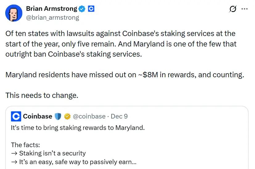 ChainCatcher 消息,Coinbase 首席执行官 Brian Armstrong 发推表示,年初时,有十个州对 Coinbase 的质押服务提起诉讼,如今只剩下五个州仍在诉讼中。马里兰州是少数几个彻底禁止 Coinbase 质押服务的州之一。马里兰州居民因此损失了约 800 万美元的奖励,而且损失还在不断增加。