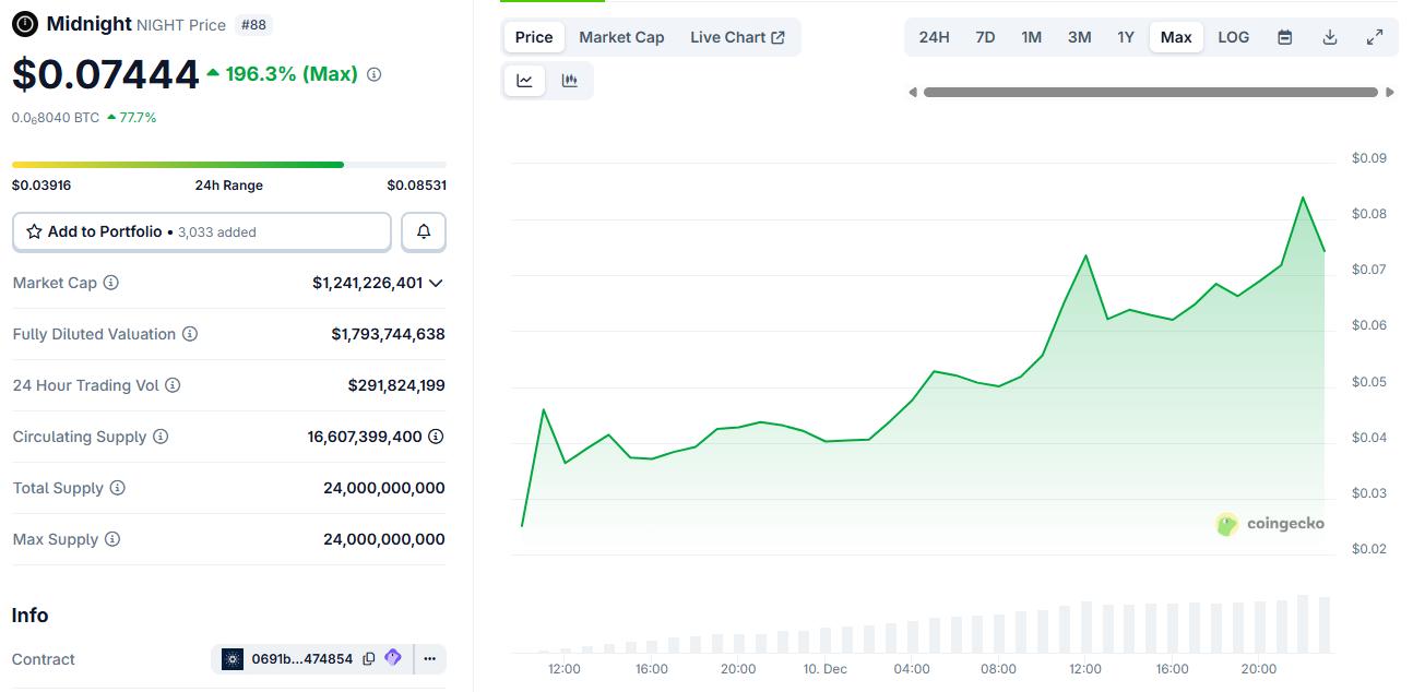 Midnight Network 的 NIGHT 代币在 12 月 9 日推出后的 24 小时内飙升了近 200%,成为 CoinGecko 和 CoinMarketCap 上最热门的资产。