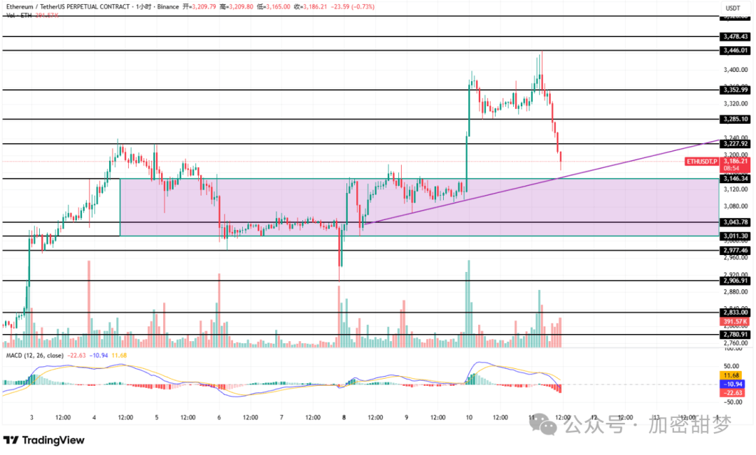 ETH今天阻力3272,支撑3150(针的部分3142),短线上如果跌穿3150后跌幅会扩大。振幅在缩小,在向右侧整理。