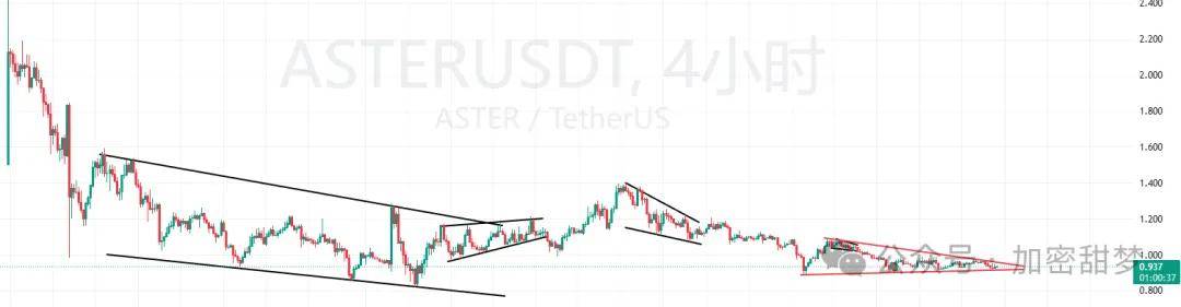 ASTER持续震荡下行,属于阴跌趋势,当前处于三角形态内,虽然cz很看好买了不少这个币,但是市场流动性还是太差了,涨一波后立马就下来了,这里来看还未出现很明显的止跌信号,大概率还是延续震荡阴跌行情,不建议入手多哦。