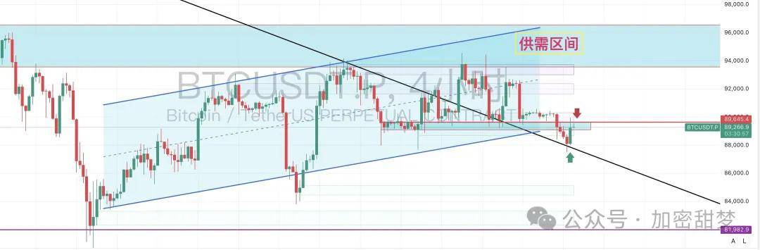 目前比特币周末经历了流动性枯竭走势,4小时级别就是一条横线,然后昨天开始有所下跌,跌破90000美金,但是市场并没有恐慌,今早开盘后重新拉了回来,但是依然没有站上90000美金。