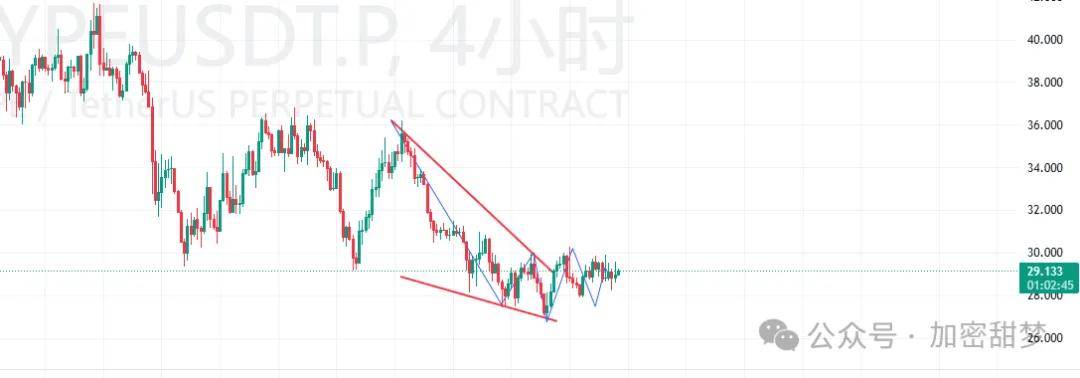 HYPE走的还是比较硬的,基本没什么变化,而且不跟大盘走,当前形态还是处于下降楔形,这是看涨形态,震荡结束后有望爆发一波,可以持续关注一下。