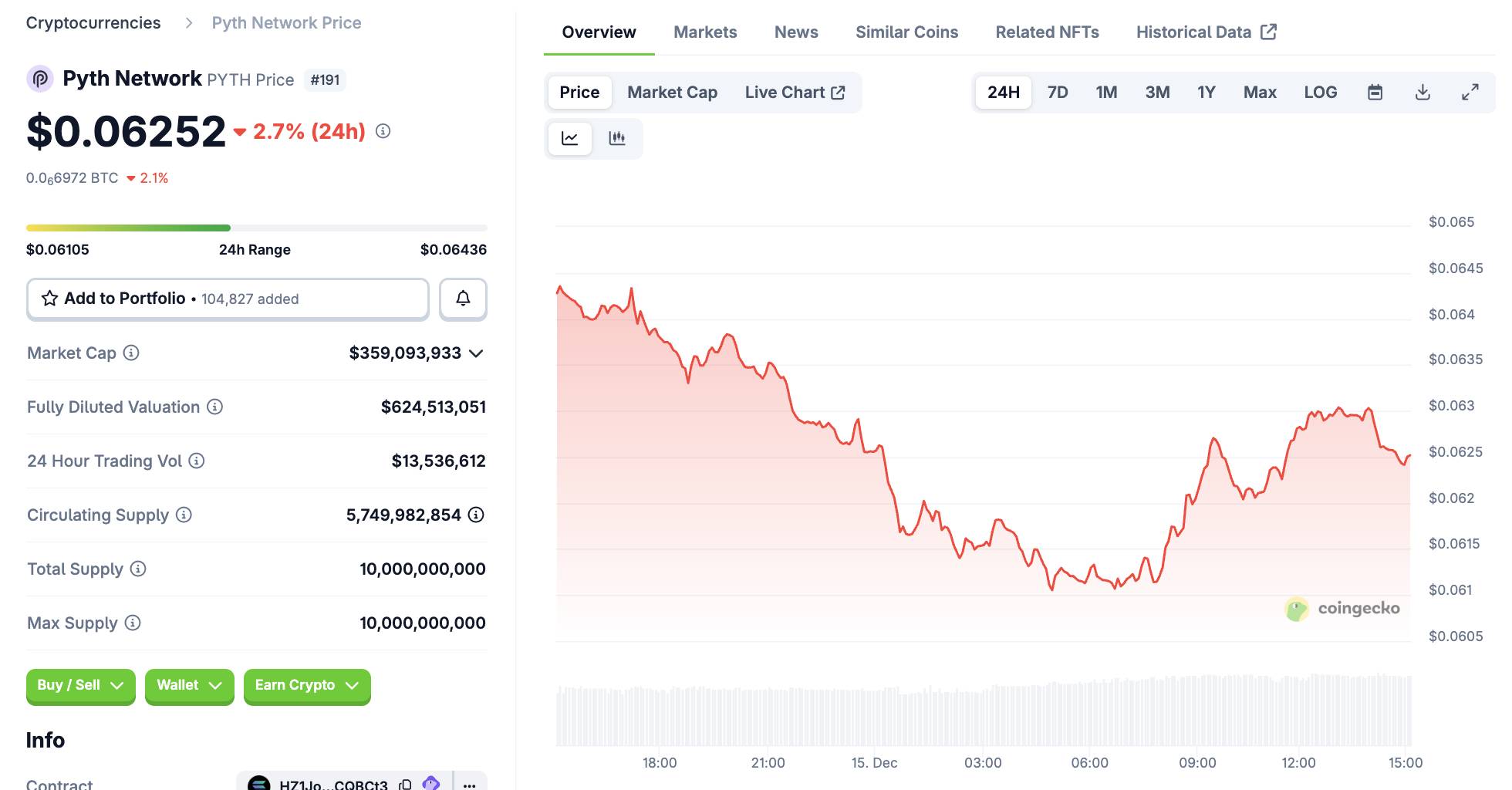 PYTH 过去 24 小时的价格波动,截图来自 CoinGecko,时间为 2025 年 12 月 15 日下午 3:00。