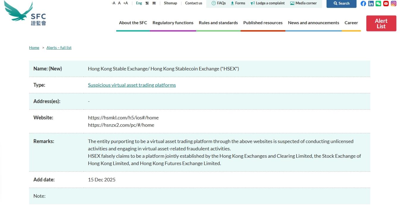 香港证券及期货事务监察委员会于2025年12月将「香港稳定币交易所」列入可疑虚拟资产交易平台警示名单。证监会指出,该实体声称经营虚拟资产交易平台,并涉嫌从事无牌活动及与虚拟资产相关的诈欺活动。该实体谎称其“由香港交易及结算所有限公司、香港联合交易所及香港期货交易所联合设立”,但实际上与这三家机构均无任何关联。