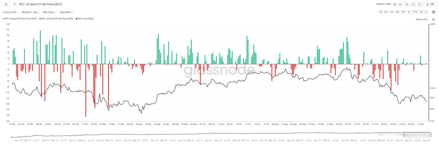 近期资金流动数据显示了这一转变。即使在价格疲软和整体市场低迷时期,比特币ETF也未出现持续或大幅的资金流出。在某些情况下,尽管现货价格下跌,净流入反而恢复。