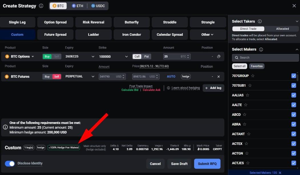 当在大宗交易的期权结构中添加对冲期权时, Deribit现在会将该对冲期权的交易费降至零,直至 2026 年底。这适用于通过Deribit大宗交易询价界面发起的大宗交易,也适用于在其他地方执行的大宗交易,包括第三方大宗交易伙伴。