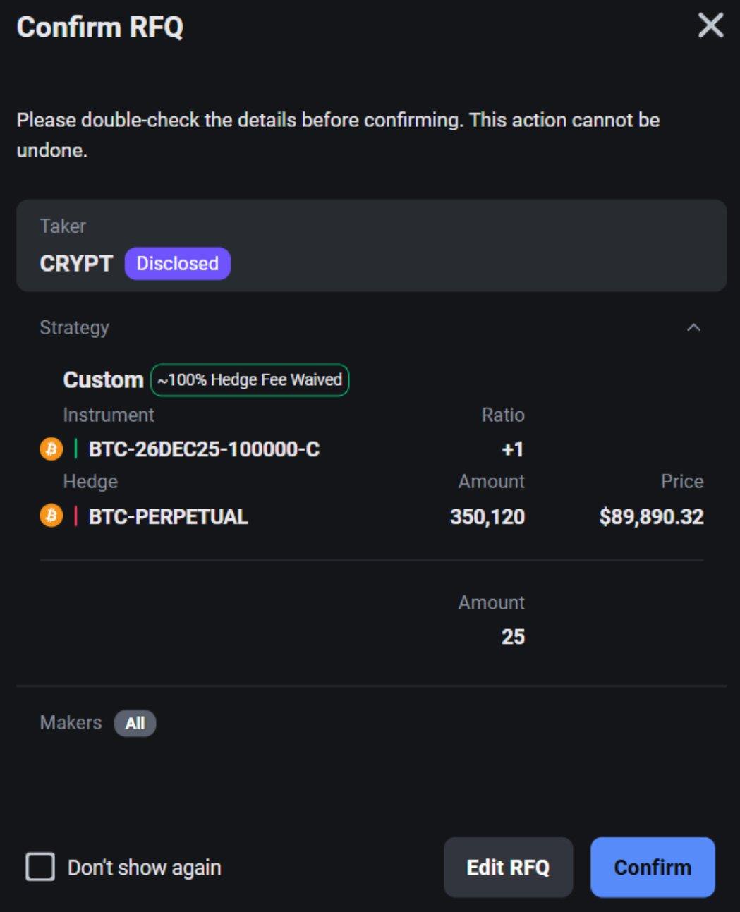 在Deribit Block RFQ 界面中,费用豁免会在 RFQ 创建屏幕和 RFQ 确认屏幕上以标签的形式直观地显示。