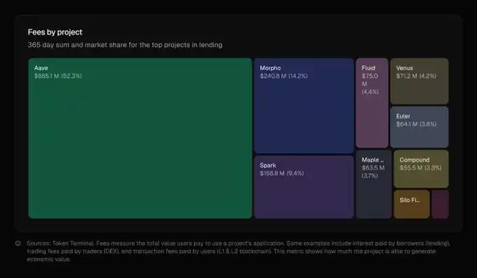 仅在今年,协议就产生了 8.85 亿美元的手续费收入,占所有借贷类协议手续费总额的 52%,甚至超过了后五大竞争对手的总和。这些手续费带来的持续收入,进一步促成了 规模可观的 AAVE 回购计划。