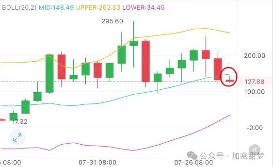 目前运行在10、15、20日和月线boll中下轨之间,它们的boll下轨均在114-102,这个范围可以作为抄底的参考之一。 同时10、15、20日EMA7-30全部被跌穿,没有支撑。
