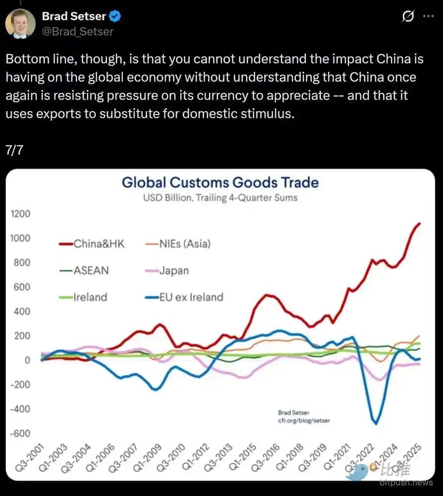 核心观点是:中国正在人为压低人民币汇率(使其出口产品获得人为的价格优势),而美元则因外国资本投资被人为高估(导致进口产品价格相对低廉)。