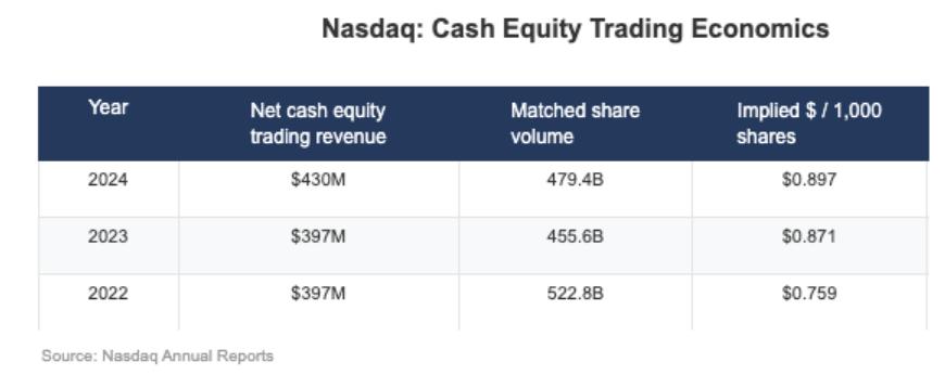 纳斯达克则属于「低毛利层」:其核心产品是「大宗商品化的交易执行」与「订单队列接入权」,定价权从机制上受到三重约束 —— 为吸引流动性需向做市商返还手续费、监管对接入费设置上限、订单路由具有高度弹性(用户可轻易转向其他平台)。