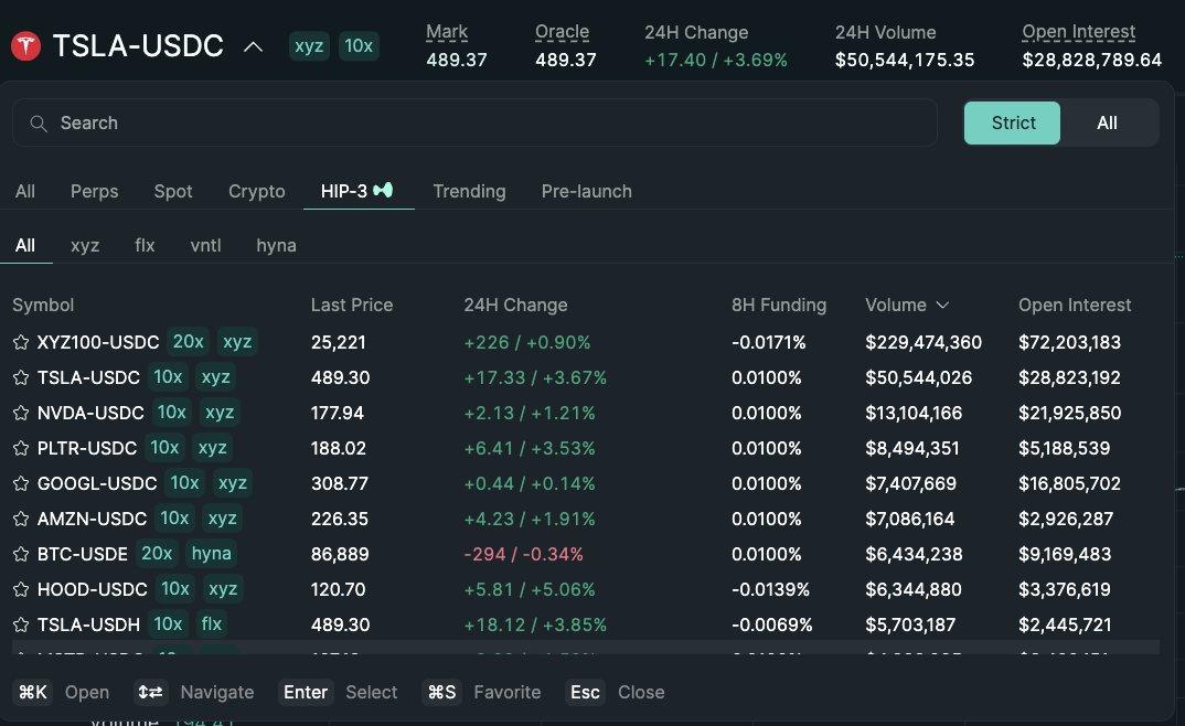 此前,Hyperliquid 曾提议「质押 HYPE 代币可享受最高 40% 手续费折扣」—— 这一设计本会让第三方前端在结构上具备「比官方界面更低价」的可行性。取消该提议后,外部分销渠道失去了「定价低于官方界面」的直接补贴。与此同时,HIP-3 市场最初仅通过「开发者分销」,未在官方前端展示;目前,这些市场已被纳入官方前端的「严格列表」。这一系列动作传递出明确信号:Hyperliquid 在「开发者层」仍保留无许可特性,但不愿在「核心分销权」上妥协。