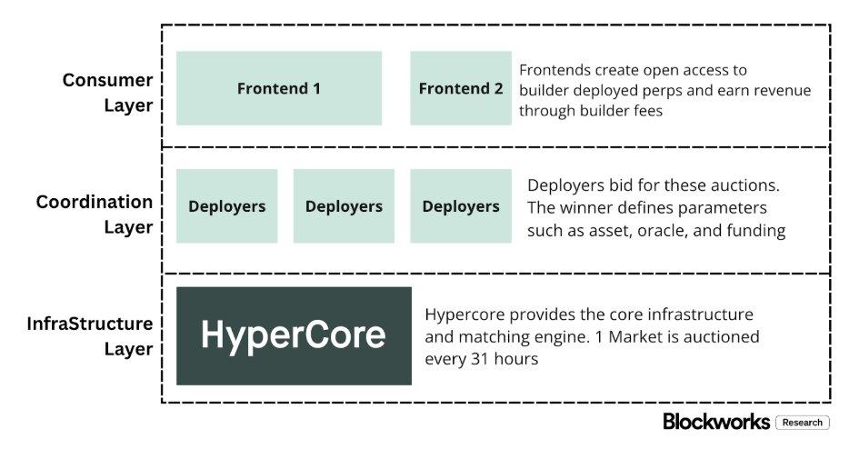 在传统金融中,交易所掌控上市权限与产品创设权;而 HIP-3 将这一功能「外部化」:开发者可基于 HyperCore 技术栈与 API 部署永续合约,并自主定义和运营交易市场。从经济角度看,HIP-3 正式确立了「交易场所与产品方的收益共享机制」—— 现货与 HIP-3 永续合约的部署方,可获得所部署资产交易手续费的 50%。