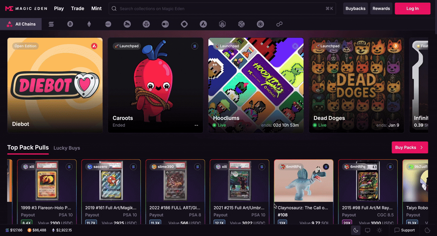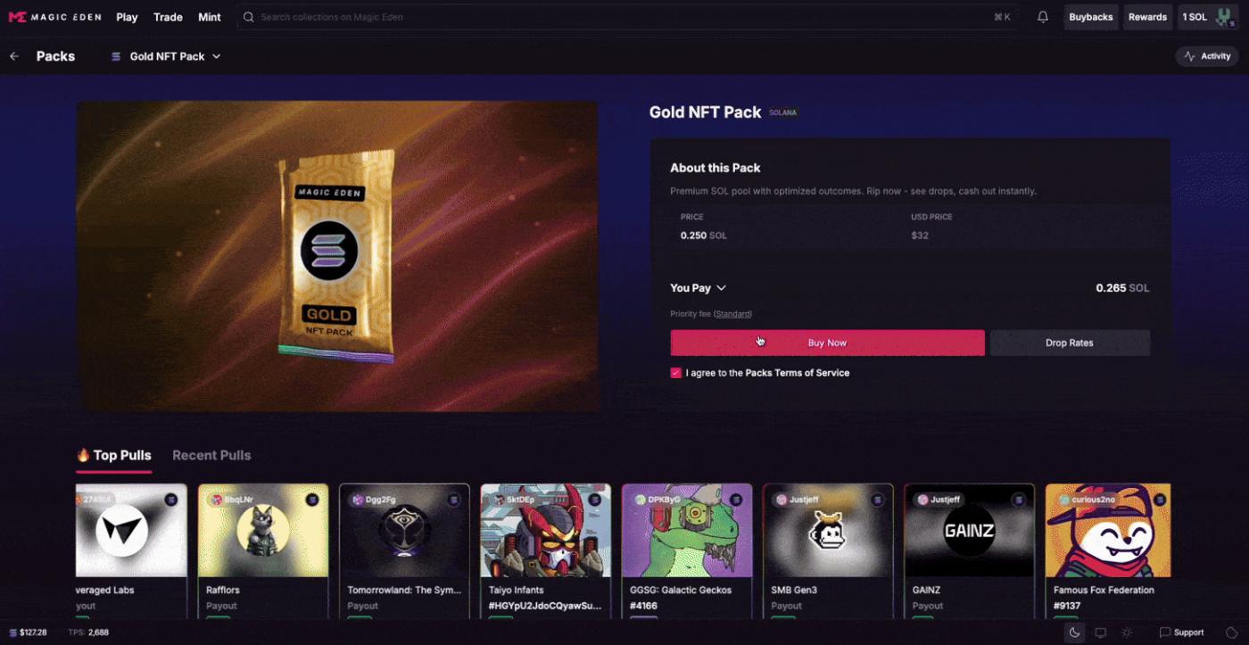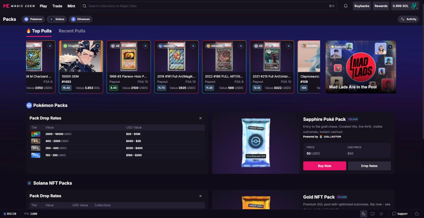 Magic Eden 现在正加倍投入这款产品:增加多包开包功能,扩展数字收藏品类别,以及更多新颖的游戏机制,如卡包对战、赠送和更丰富的游戏效果。