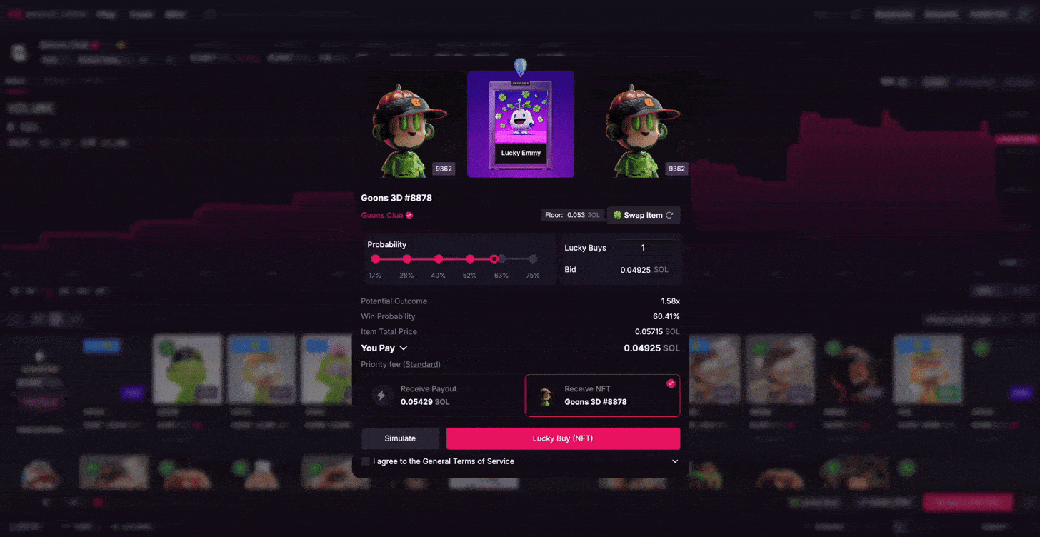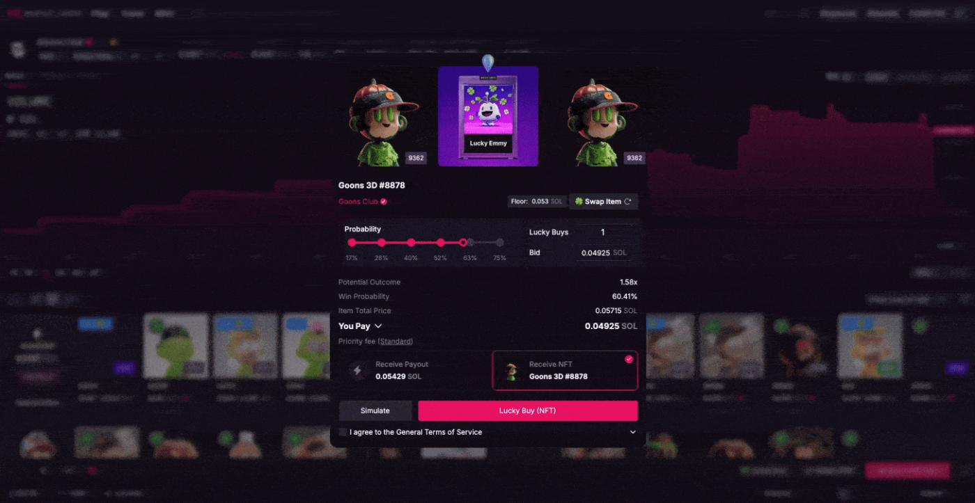 这种策略的最佳案例是“幸运购买”。该产品于 2023 年 9 月推出。用户可以通过轮盘赌的方式,以较小的投入尝试赢得高价值的 NFT,而无需支付全价。