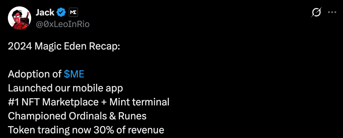联合创始人杰克在X上表示,截至2024年,代币交易收入已占总收入的30%以上。这标志着公司与过去完全依赖NFT交易费的模式发生了显著转变。随着Magic Eden在2025年增加游戏功能,发展成为一个娱乐平台,这一转变还将持续下去。