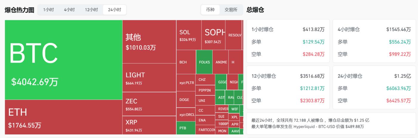 BTC 爆仓金额达 4042.69 万美元,ETH 爆仓 1764.55 万美元。过去 24 小时内共有 72,256 人被爆仓,最大单笔爆仓出现在 Hyperliquid 的 BTC-USD 交易对上,价值 489.88 万美元。