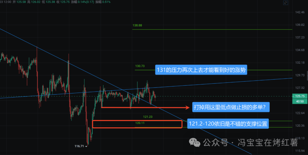索子上的支撑还是121.2-120之间,要留意下来这里获取流动性的可能。上方压力131还要再次上去才能看到较好的涨势。
