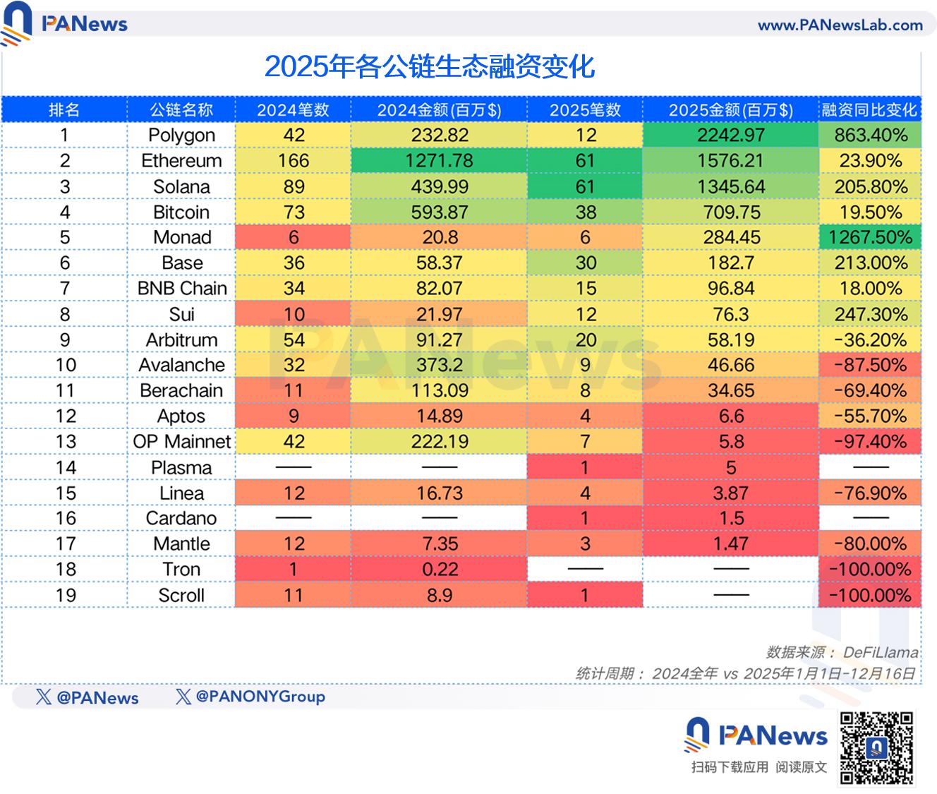 此外,还有个数据维度同样值得关注,那就是融资情况。2025年的加密行业在融资方面再创新高,PANews统计了6710条融资情况,并将这些融资事件按照所属的公链进行分类对比。从数据的结果来看,2025年这些公链的融资笔数有了大幅下降,从640笔降到了293笔。但总金额却从3.5亿美元增长至6.67亿美元,单笔平均融资金额从557万美元增长至2279万美元。这也侧面显示出,当下市场当中中小创业团队融资的难度可能更大,而资本则更愿意在一些明星项目身上投入更多资金。