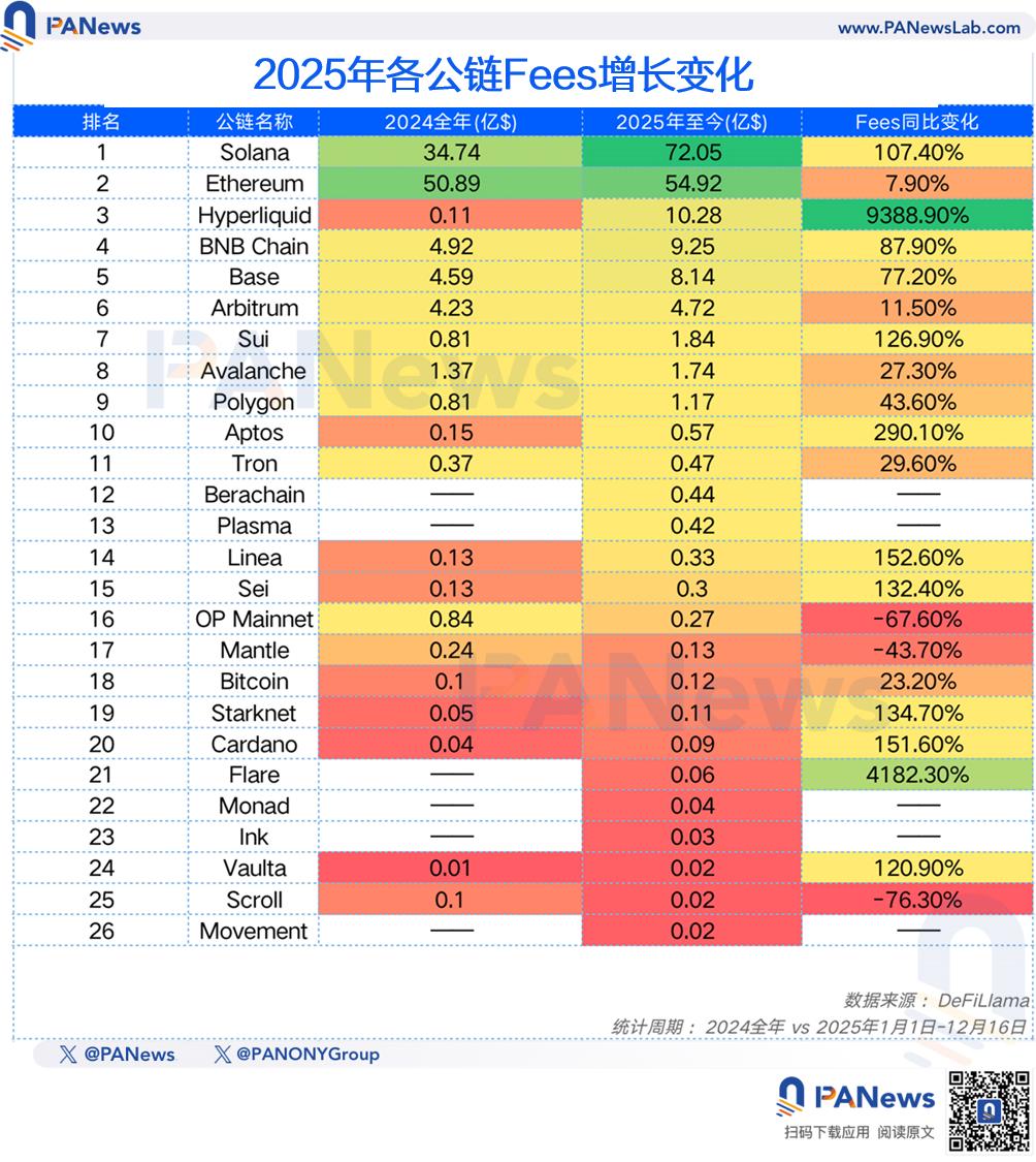费用增幅最大的仍是Hyperliquid(9388.9%),这也主要源于Hyperliquid在2024年底时刚刚上线,初始基数较小。此外,Solana的费用实现了107%的增长,BNB Chain为77%、Sui达到126%、Aptos为290%。可以说,2025年主流公链的创收能力得到了很大的提升。