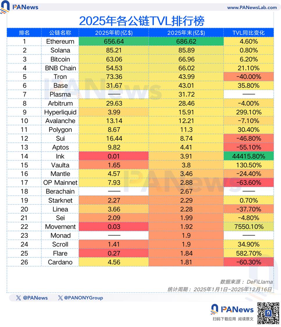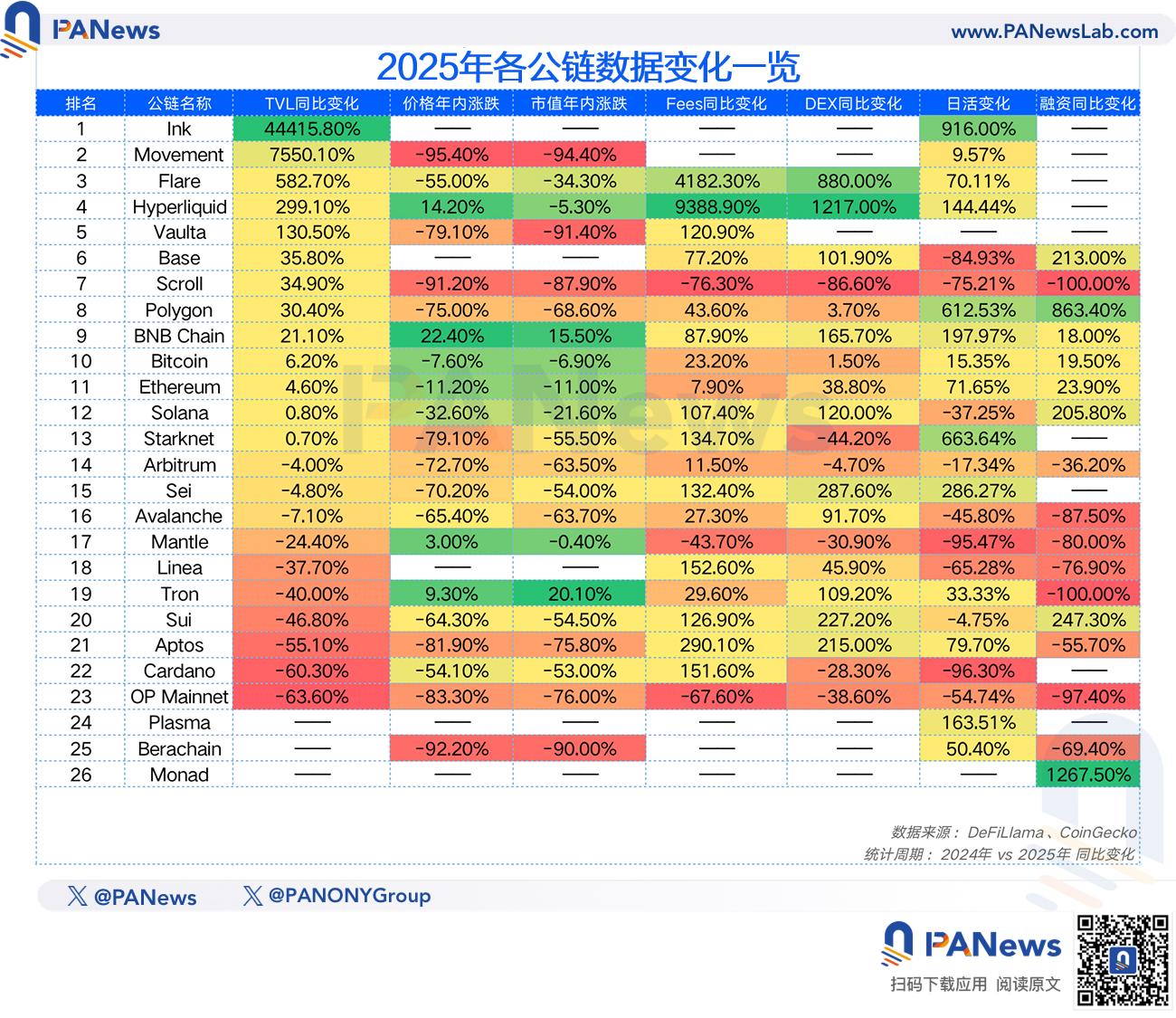 PANews数据团队全面统计了26条主流公链的2025年核心数据,从TVL、币价、费用收入、活跃度到投融资情况,我们试图透过这些冰冷的数字,还原公链市场在这一年经历的“挤泡沫”过程,并寻找那些在寒冬中依然能够构筑起坚实护城河的真正赢家。