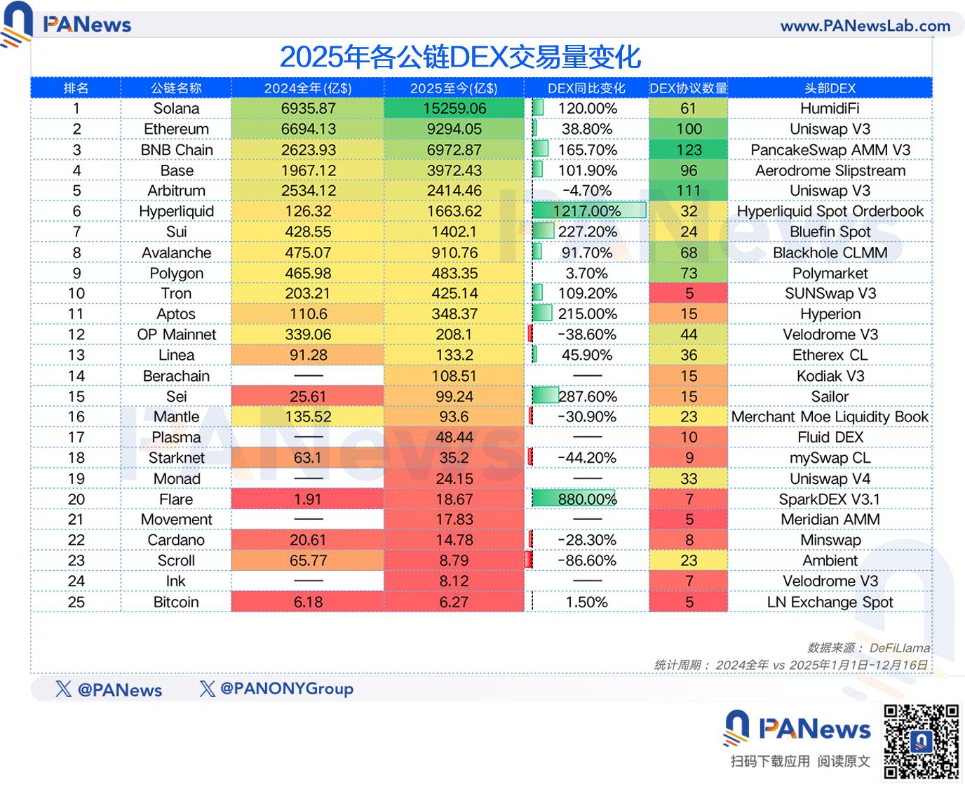 除此之外,在各个公链的DEX的交易量方面也总体实现了88%的增长,平均的增幅达到163%。其中,Solana更是完成对以太坊的逆袭,以1.52万亿美元登顶交易量最高的公链,BNB Chain也以6972亿的交易量紧紧跟随以太坊,极有可能在2026年同样对以太坊完成反超。