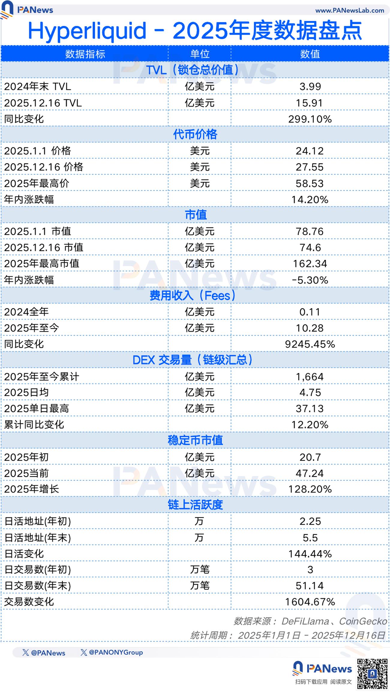 与BNB Chain类似,Hyperliquid在2025年同样大放异彩,除了市值较年初略有下降(-5.3%)之外,其他的数据都是正增长,并且多个数据的增幅都是所有公链中最大的。