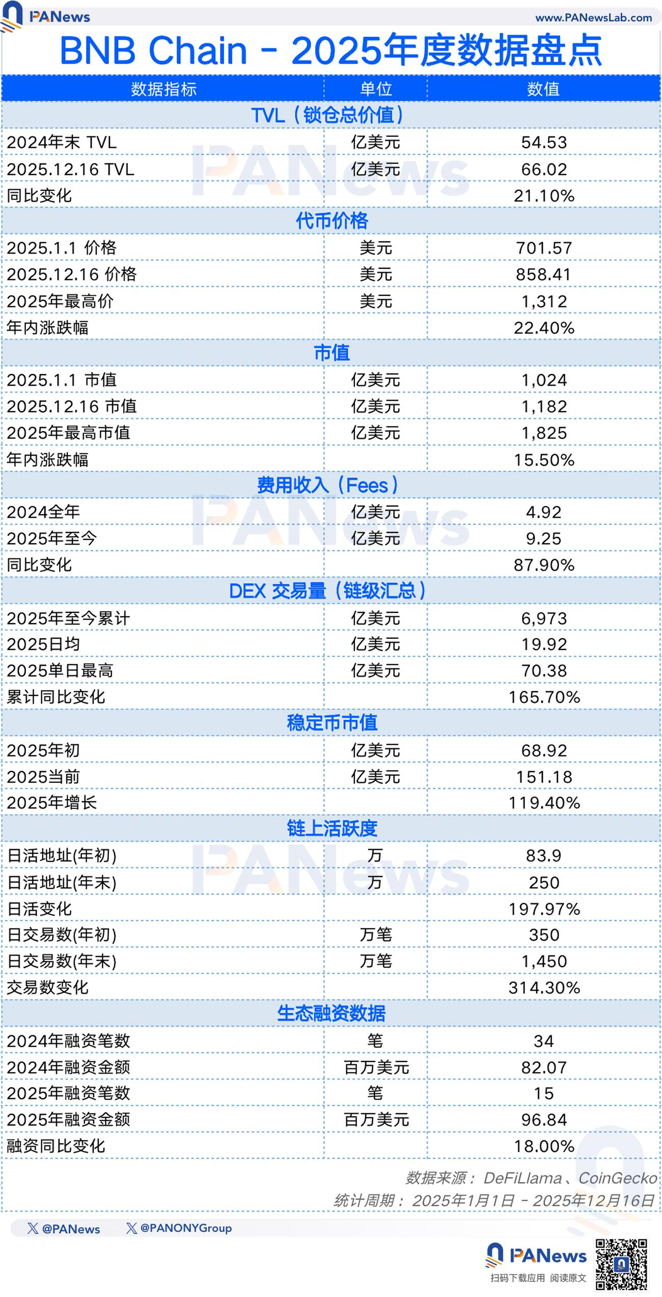 BNB Chain在2025年实现了全面爆发,在所统计的所有数据维度当中都实现了正增长。尤其是费用收入、DEX交易量、稳定币市值、链上活跃度等方面几乎都是超过1倍以上的增长。这在整个公链市场低迷的状态之下是罕见的。