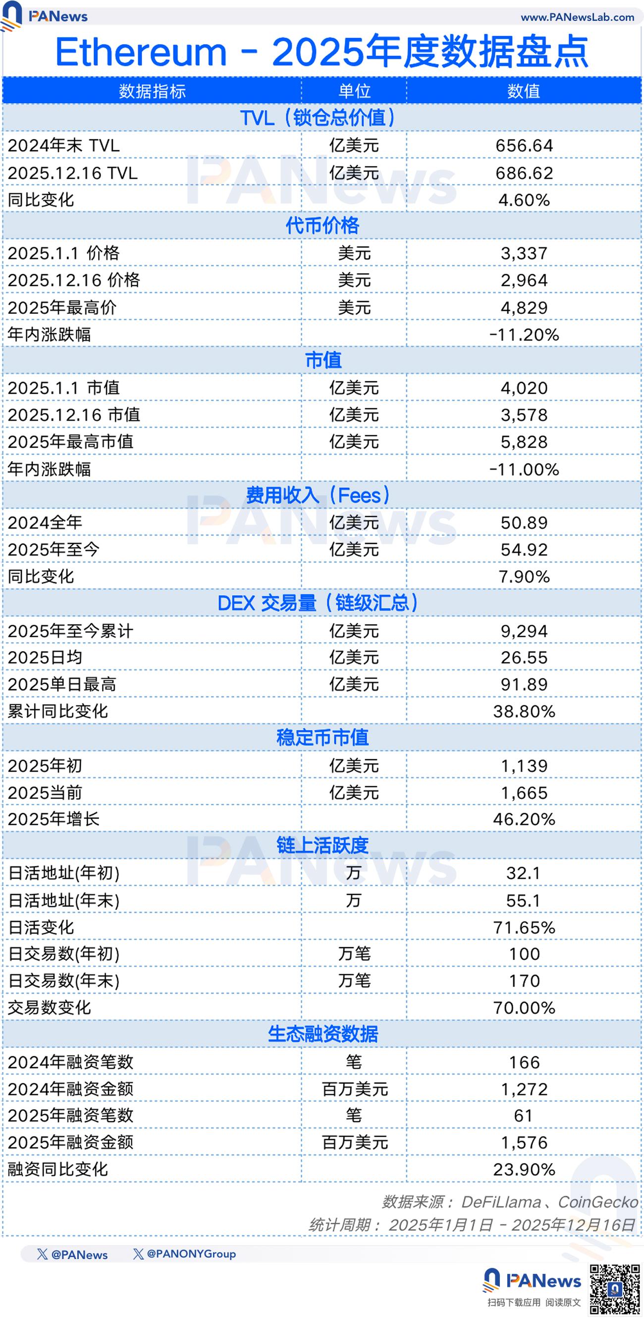 (数据说明:TVL、稳定币、融资及费用情况等数据采用Defillama,日活和日交易量数据来源于Artemis及链上信息、代币价格及市值数据采用Coingecko数据作为来源。数据周期为2025年1月1日至12月16日。)