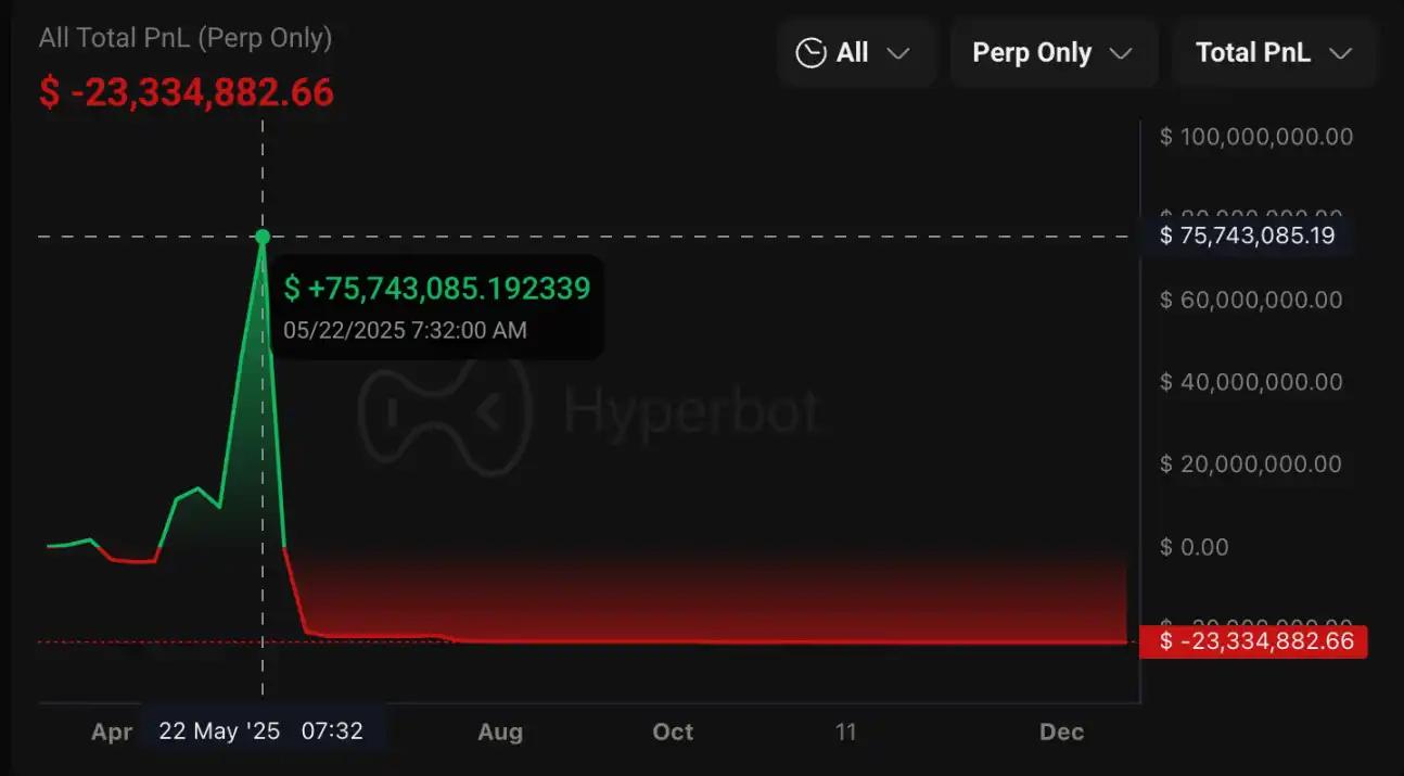 同样是合约交易,James Wynn 的神话始于 PEPE,但爆发于 Hyperliquid 的合约战场。2025 年 3 月,James Wynn 带着从 PEPE 赚到的 2500 万美元巨款杀入 Hyperliquid 开启了合约交易。这笔 2500 万美元的巨款是其靠仅仅 7600 美元的本金从 2023 年重仓押注 Meme 币 PEPE 赚到的,但现货的涨幅满足不了他,在 3 月至 4 月期间,他通过激进做多 PEPE 和 ETH,再次获利 2500 万美元,变成了手握 5000 万美元的超级巨鲸。