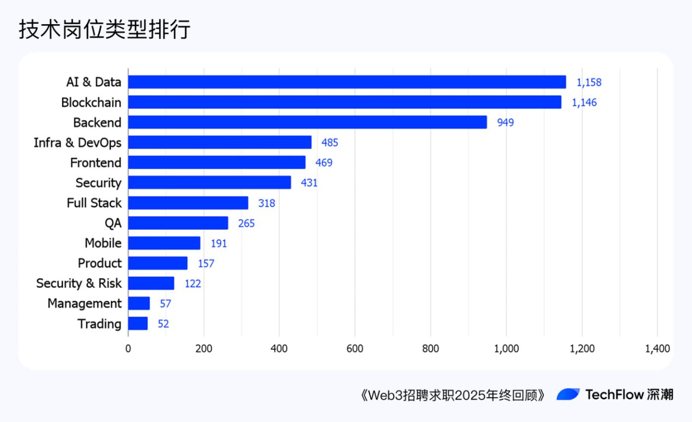AI 数据需求与区块链开发需求遥遥领先,随后是后端、Infra 开发、运维、安全等与去中心化网络存续息息相关的岗位,之后是前端、全栈、QA、移动等,由底层逐渐向用户侧过渡。