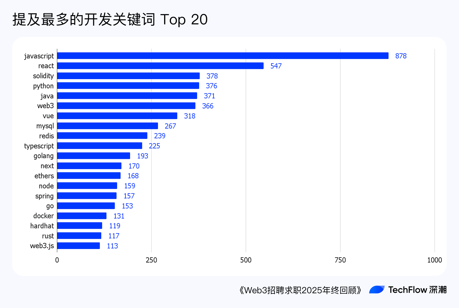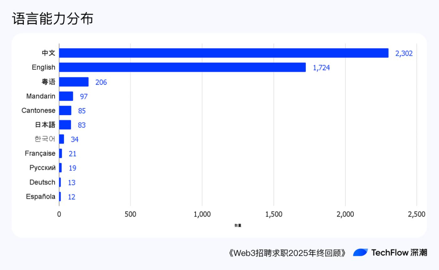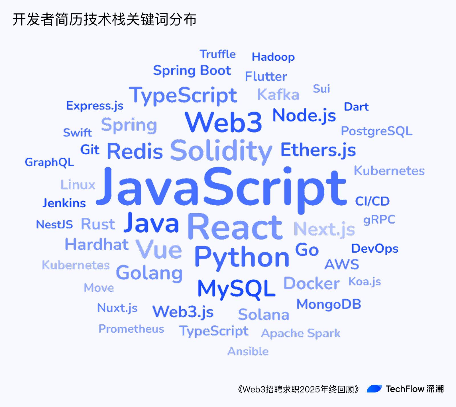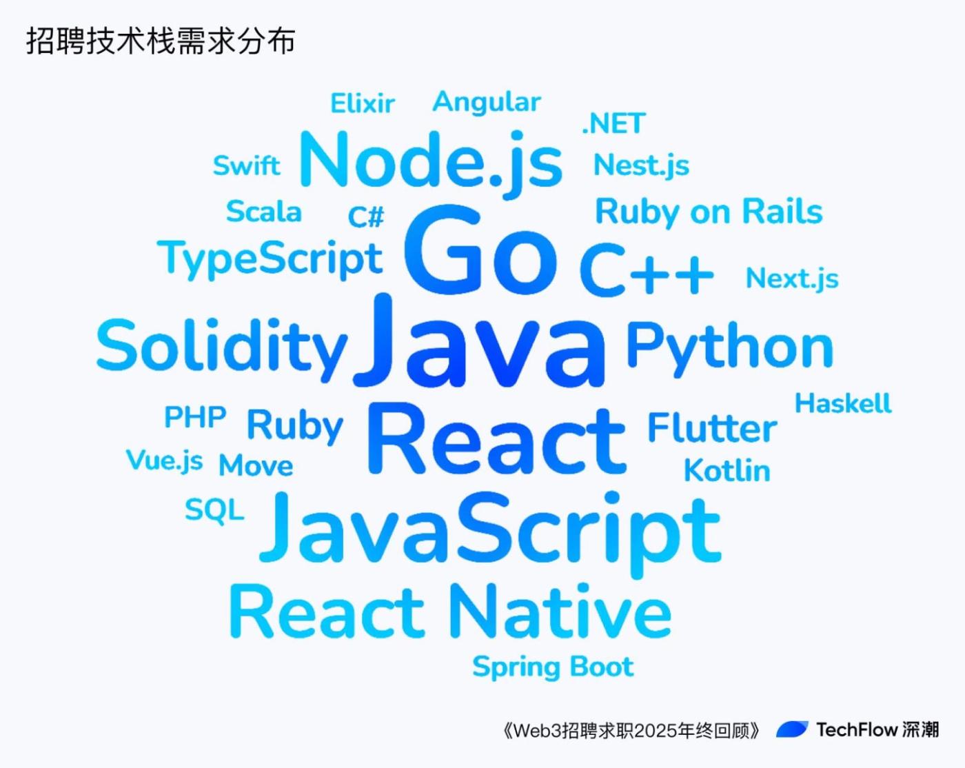 Node.js、C++、Kotlin、Ruby、Scala 等语言在特定场景下也有一定需求。Solidity、Move 这类链上原生开发语言仍然相对小众。