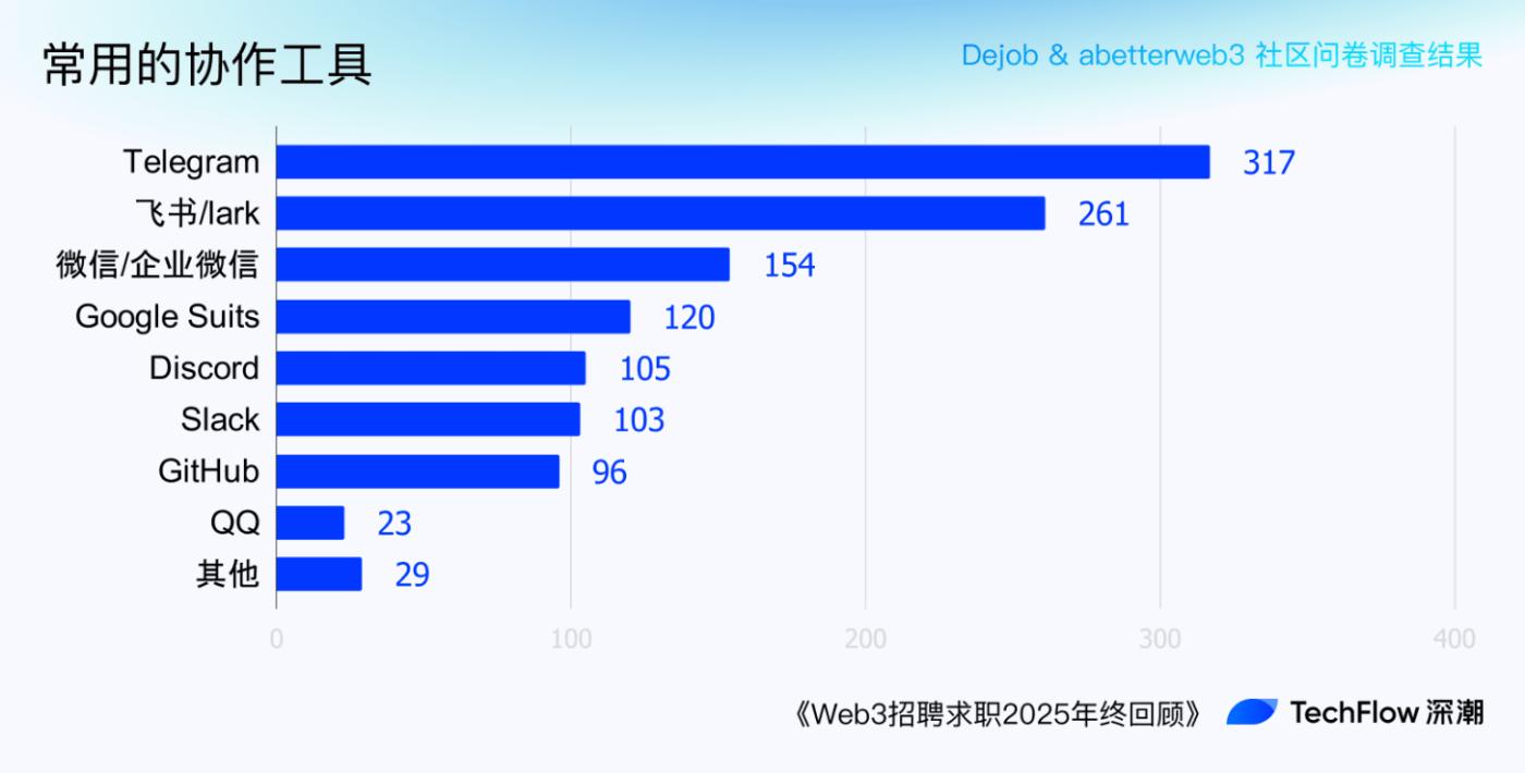 远程协作工具上,因为本次调查发生在华语垂直 Web3 招聘社区,Telegram 因其保密性和好用被大多数公司青睐,随后是国内的主流工具飞书、微信,最后是外企常用的 Google Suits,Discord,Slack 等。